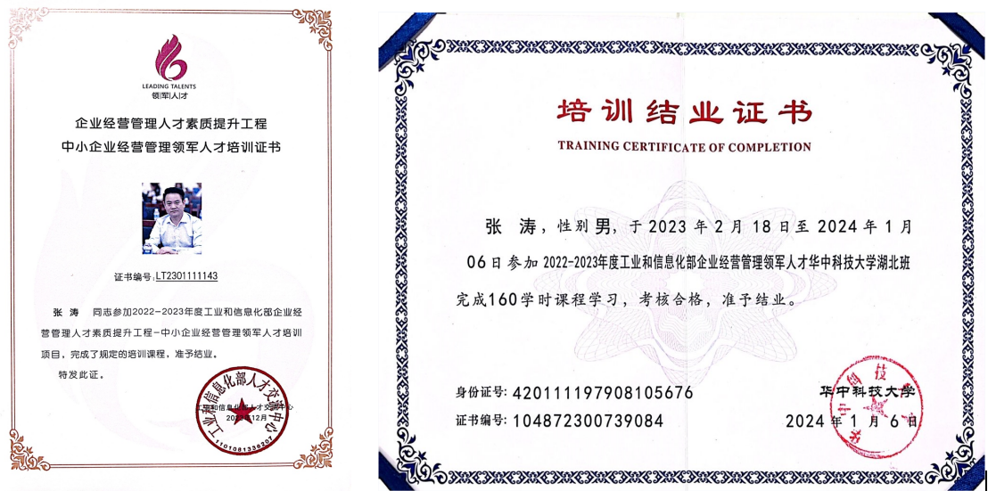 我司董事長兼總經理張濤參加了2022~2023年度為期一年中小企業經營管理領軍人才華中科技大學湖北班的培訓學習,并經考核合格順利結業。
